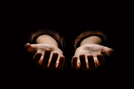 Female weary hands, palms up on a black isolated background. Concept of Hope and Support.