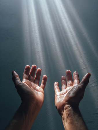 Two hands are lifted upward, bathed in soft rays of light, symbolizing a search for inspiration and hope in a tranquil environment.
