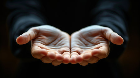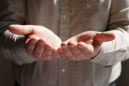 Male weary hands, palms up on a black isolated background. Concept of Hope and Support.