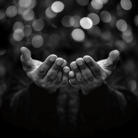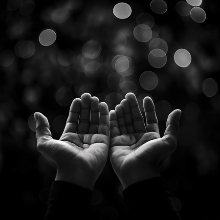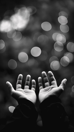 Close-up image of two hands raised in prayer, suggesting hope, faith, and supplication. The dark background emphasizes the spiritual aspect.