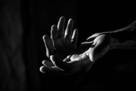 A monochromatic image showing a persons hand reaching forward against a dark backdrop. The interplay of light and shadow emphasizes its texture and form, creating visual interest.