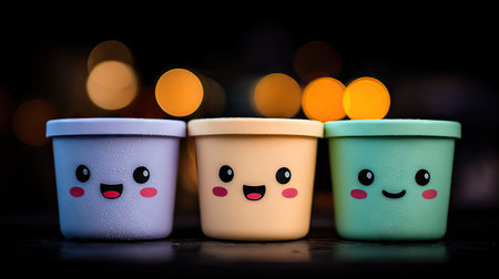 Three small, round containers, each with a cartoon face design, are displayed against a dark background with bokeh lights. The containers are pastel shades of purple, light yellow, and light green, and appear close together. Water droplets are visible on the surface of the containers.
