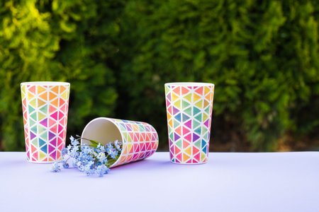 Close up isolated eco-friendly natural coffee cup. Disposable ecological utensils in hands on green grass background. Sustainability of planet. Cardboard glass made of fiber of bamboo and bagasse