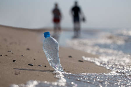 A discarded plastic bottle rests on a beach shoreline, reflecting environmental challenges. Waves crash nearby under a picturesque sunset, highlighting pollution.