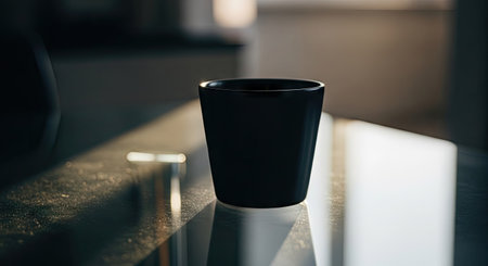 Black coffee cup on a table in a cafe, close-up