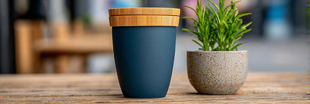 Sustainable Sipping A Blue Reusable Coffee Cup Next to a Lush Potted Plant on a Stylish Tabletop