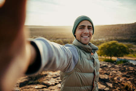 Cropped portrait of a handsome young man taking selfies while hiking in the mountains.