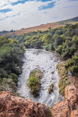 Seasonal river in the gorge in Morocco in wet season is full of life: plants and animals. Soothing full of vivid green view.