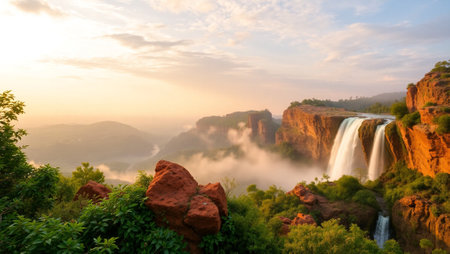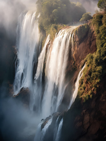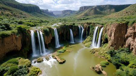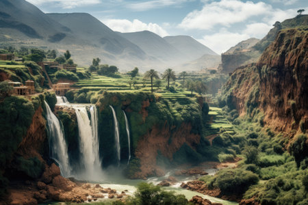 A Majestic Ouzoud Waterfalls cascading into lush green valley, stunning view