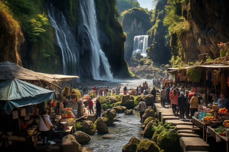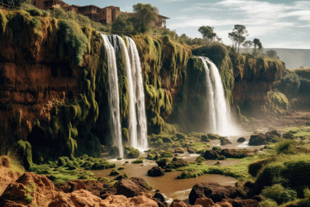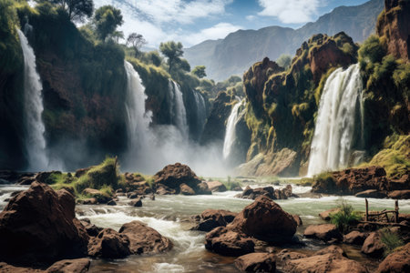 Waterfall in the mountains of Morocco, Africa. Panoramic view, Ouzoud waterfalls, Grand Atlas in Morocco, AI GeneratedWaterfall in the mountains of Morocco, Africa. Panoramic view, Ouzoud waterfalls, Grand Atlas in Morocco, AI Generated