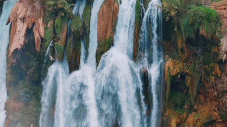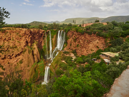 A Breathtaking Ouzoud Waterfalls cascading into lush green valley