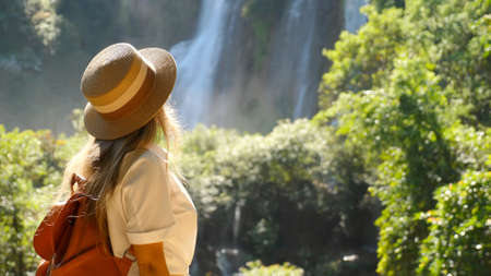 Travel woman enjoy amazing view of waterfall nature. Female traveler in hat with backpack in Asia adventure or journey. Cinematic video of girl in tropical vacation