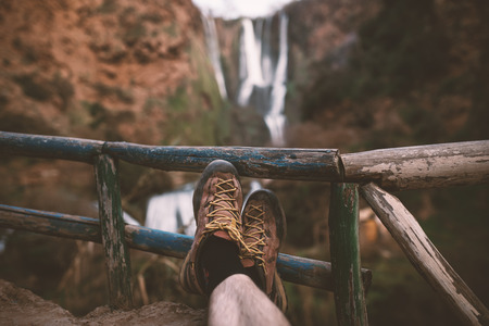 Man´s trekking shoes in a nature of Morocco - Ouzod falls. Close up of hiking boots against waterfall. Man hiking enjoying a view after trek.