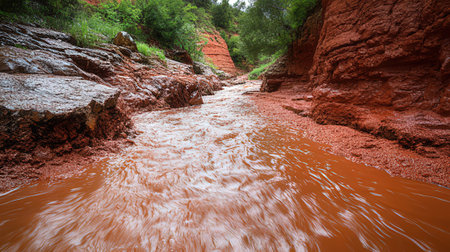 Landscape of river flowing through red sandstone cliffs in the forest