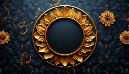 A luxurious round golden frame features a sunflower petal design against a black background.