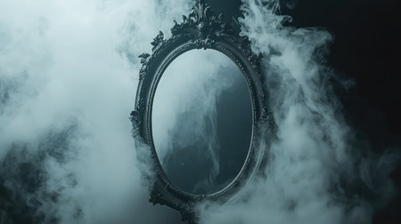 A creepy, old-fashioned mirror with ghostly mist forming eerie shapes around it.