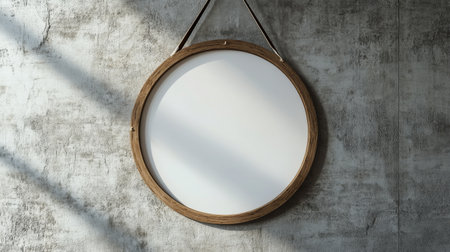 A round wooden frame mirror is elegantly suspended against a textured concrete wall, showingcasing contemporary decor. The minimalistic design complements the industrial aesthetic of the space.
