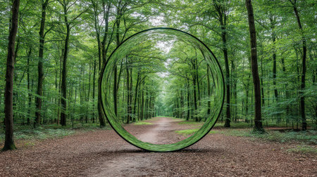 A circular structure frames a path leading through a dense forest. The image features a symmetrical composition with trees on both sides of the path. The scene is illuminated by sunlight creating a sense of depth and inviting exploration. Potential applications could include advertising or editorial content.