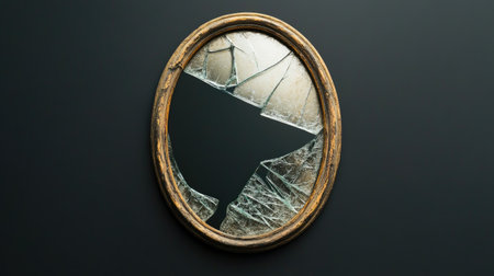 A broken mirror in an ornate frame reveals stunning cracks on a dark background, creating a moody atmosphere and exploring themes of reflection and imperfection.