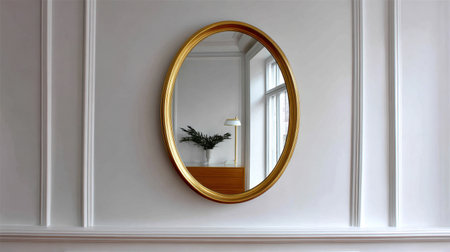 Decorative wall mirror with a simple frame, with blank space for text on the surrounding wall.