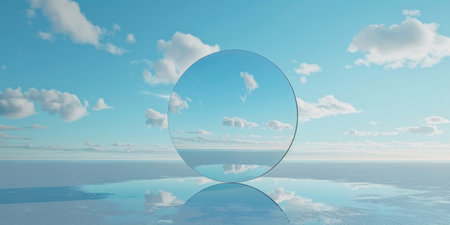 In the close-up shot, a mirror captures the reflection of a cloudy sky in the background. The mirrors surface is clean and reflective, showing the skys colors and clouds.