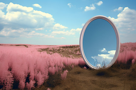 Mirror on a meadow with pink flowers. 3d rendering