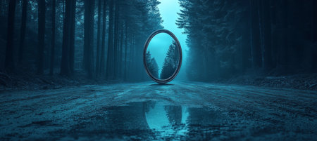 Mysterious Floating Oval Mirror Reflecting a Forest Path, a Magical Portal to Another Dimension