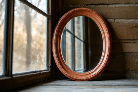 Oval mirror with copper frame on wooden surface