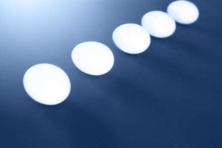 Five easter white eggs on blue background. Easter concept.