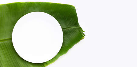 Empty white plate on banana leaf