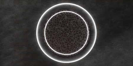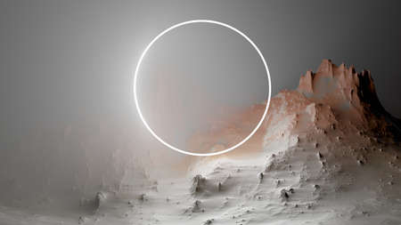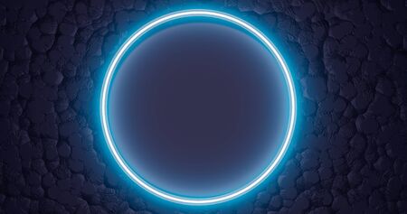 3d rendering. Neon glowing circle or hoop against the background of a relief texture. Graphic illustration for your business.