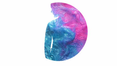 Art silhouette. Spiritual energy. Shiny pink blue paint splash double exposure outline of peaceful woman in circle frame isolated on white copy space background.