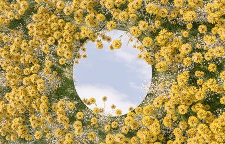 Sky reflection in mirror on spring flower field.