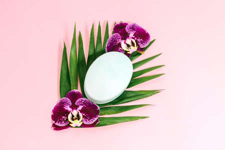 Purple orchid with soap on a pink background. Space for text.