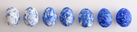 top view Easter eggs in row in the color of the year-classic blue with gradient effect on white background for banner