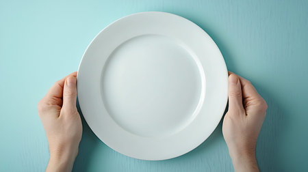 Empty white plate in female hands on blue background. Top view.
