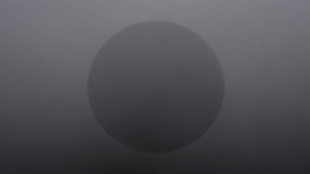 Spherical object in the center of the frame, surrounded by a thick layer of fog,.