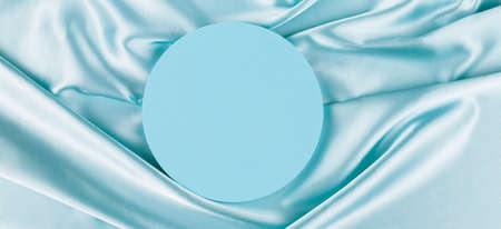 Geometric platform podium on light blue silk satin background. Blank minimal cylinder form mock up background for cosmetic product presentation
