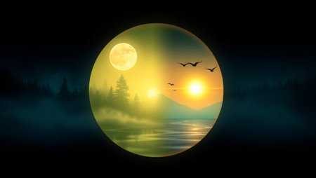 Foggy landscape with full moon and flying birds in the sky