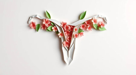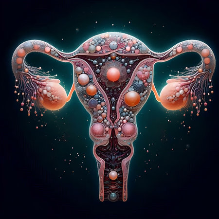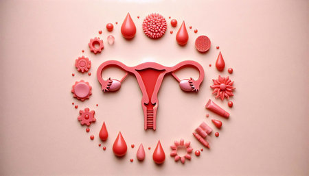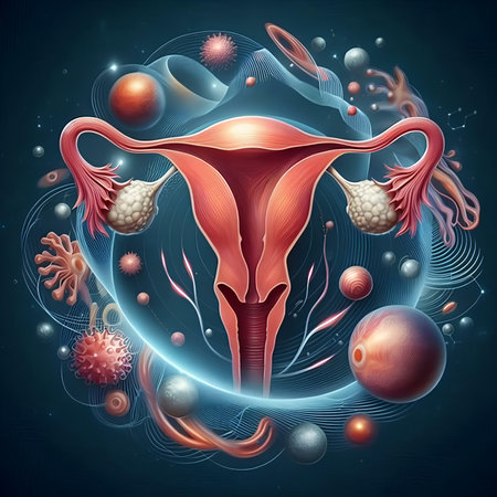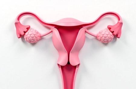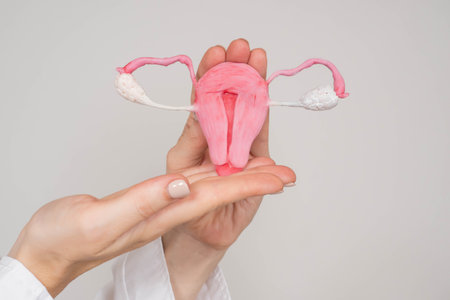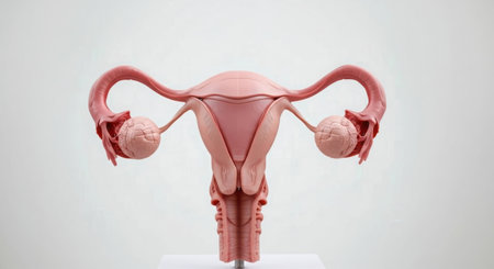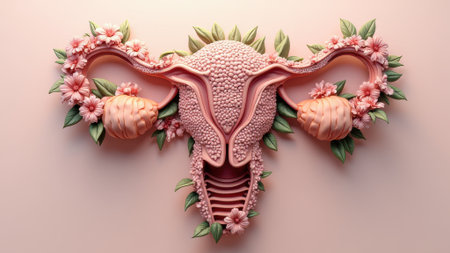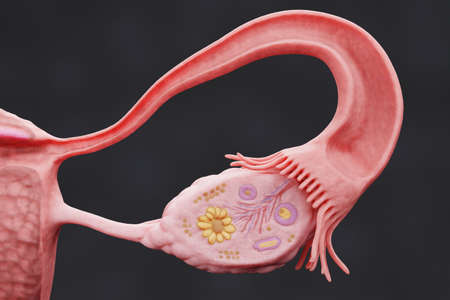 A detailed anatomical model displays the uterus, fallopian tubes, and ovaries, presented against a neutral background.