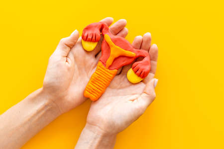 Holding an uterus organ with ovaries in the hands, female reproductive system, pregnancy and gynecological concept, diseases like cancer and polycystic