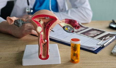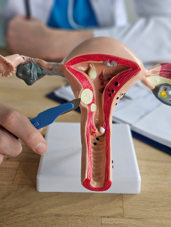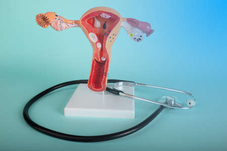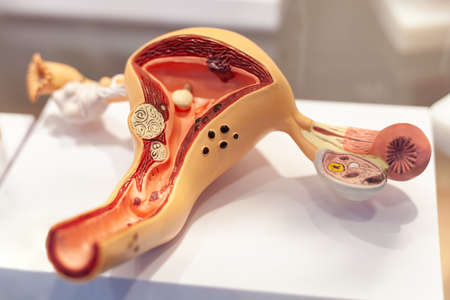 Detailed model of the female reproductive system shown with emphasis on ovarian cysts and health examination