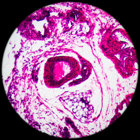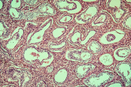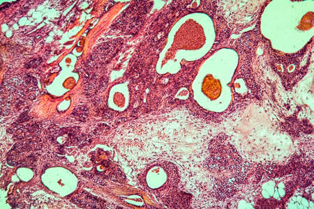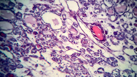 Ovarian cancer, light micrograph, photo under microscope. Photograph shows a fragment of a cancerous tumor in the female ovary. Selective focus