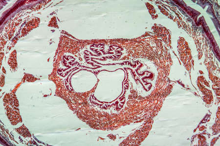 Columnar epithelium of human gall bladder under the microscope in Lab.