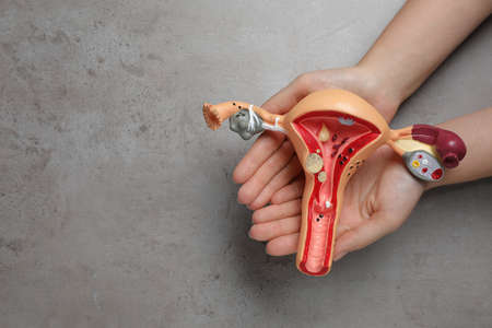 female uterus. Model of uterus and ovaries at doctor. Problem concept with female organs. Women's sexual health. Treatment of Ovarian Gynecological Diseases. Hands of gynecologist on gray background.