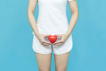woman in white clothes holding red heart put on the genitalia area or Itching urinary Health-care concept on blue background