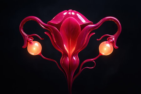 High glossy pink stylized female reproductive system with glowing ovaries, resembling a blossoming flower on a dark background.