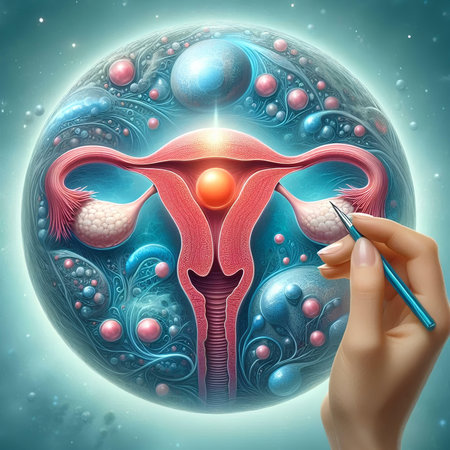 A detailed anatomical model displays the uterus, fallopian tubes, and ovaries, presented against a neutral background.