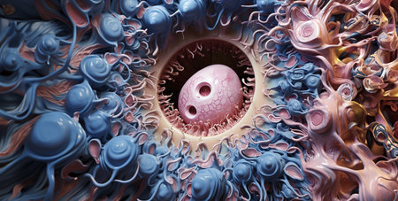 Abstract representation of biological cells with interconnected structures, showcasing vibrant red and blue tones. Conceptual depiction of cellular activity and science.