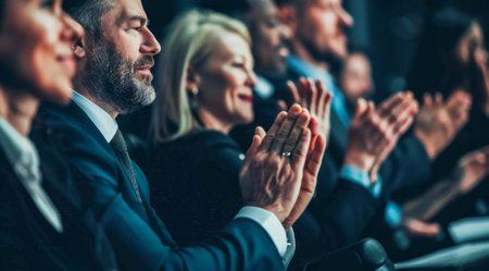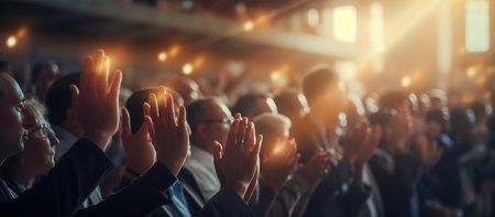 Audience members enthusiastically clapping hands in a low angle view, celebrating success and achievement at a formal event or performance with bright stage lights and bokeh.